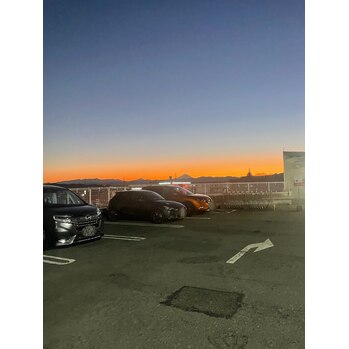 隣のコストコ駐車場から夕焼けに染まってら富士山♪