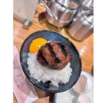 目の前に焼き上がりのハンバーグが置かれて、ご飯の上に乗っけて最後に卵黄をイン!
